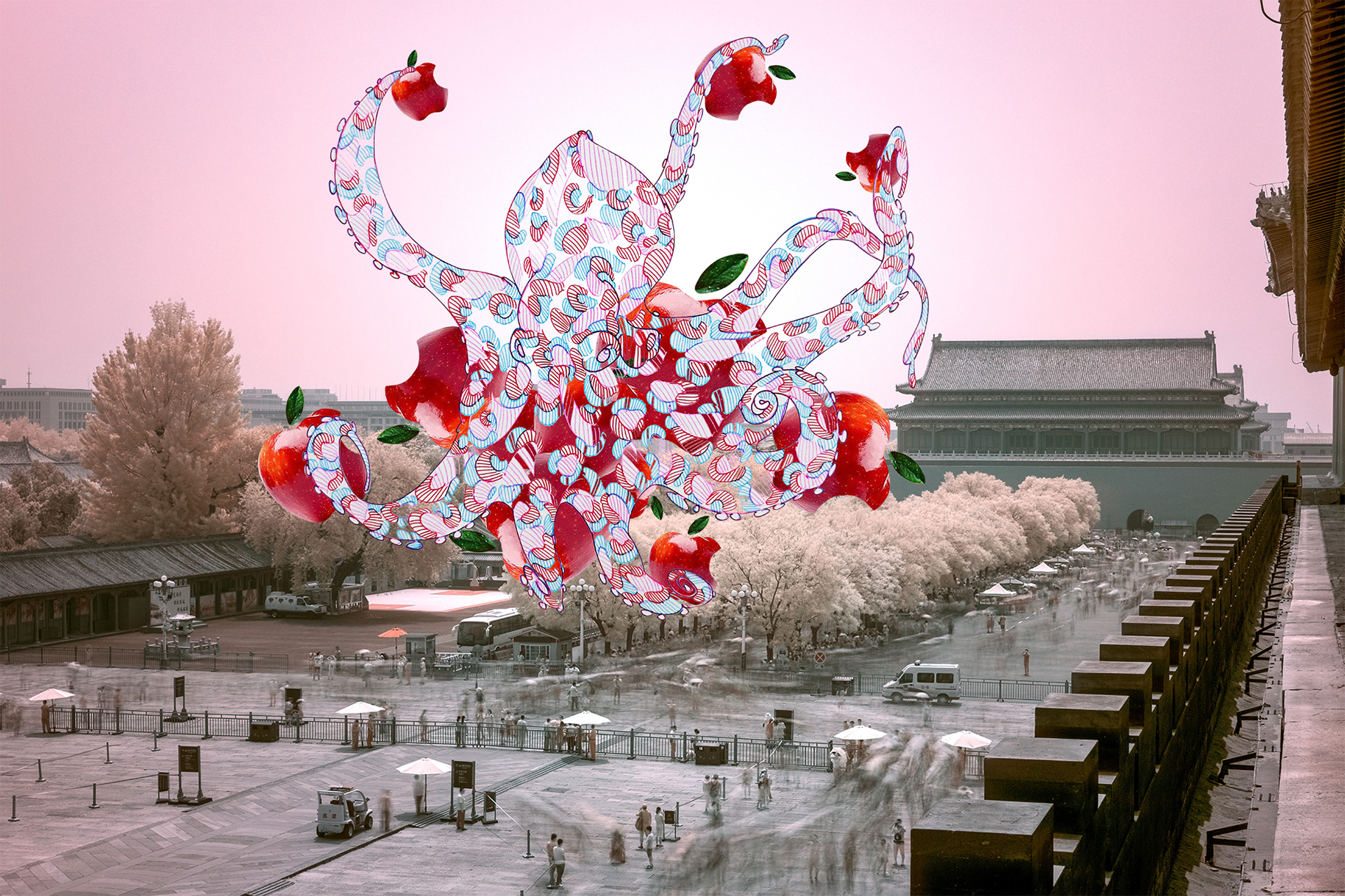 It is a story of ‘an octopus eating apples’. An octopus that came to eat apples by necessity is devouring apples without knowing that those apples give a poison. It is natural to recognize love of necessity, as we are the beings that need each other. The transparent octopus needs apples to fill her body because of poverty and becomes addictive to apples. The Forbidden City, a symbol of power and authority, welcomes numerous visitors. And ‘an octopus eating apples’ appearing at its front yard represents us in poverty.