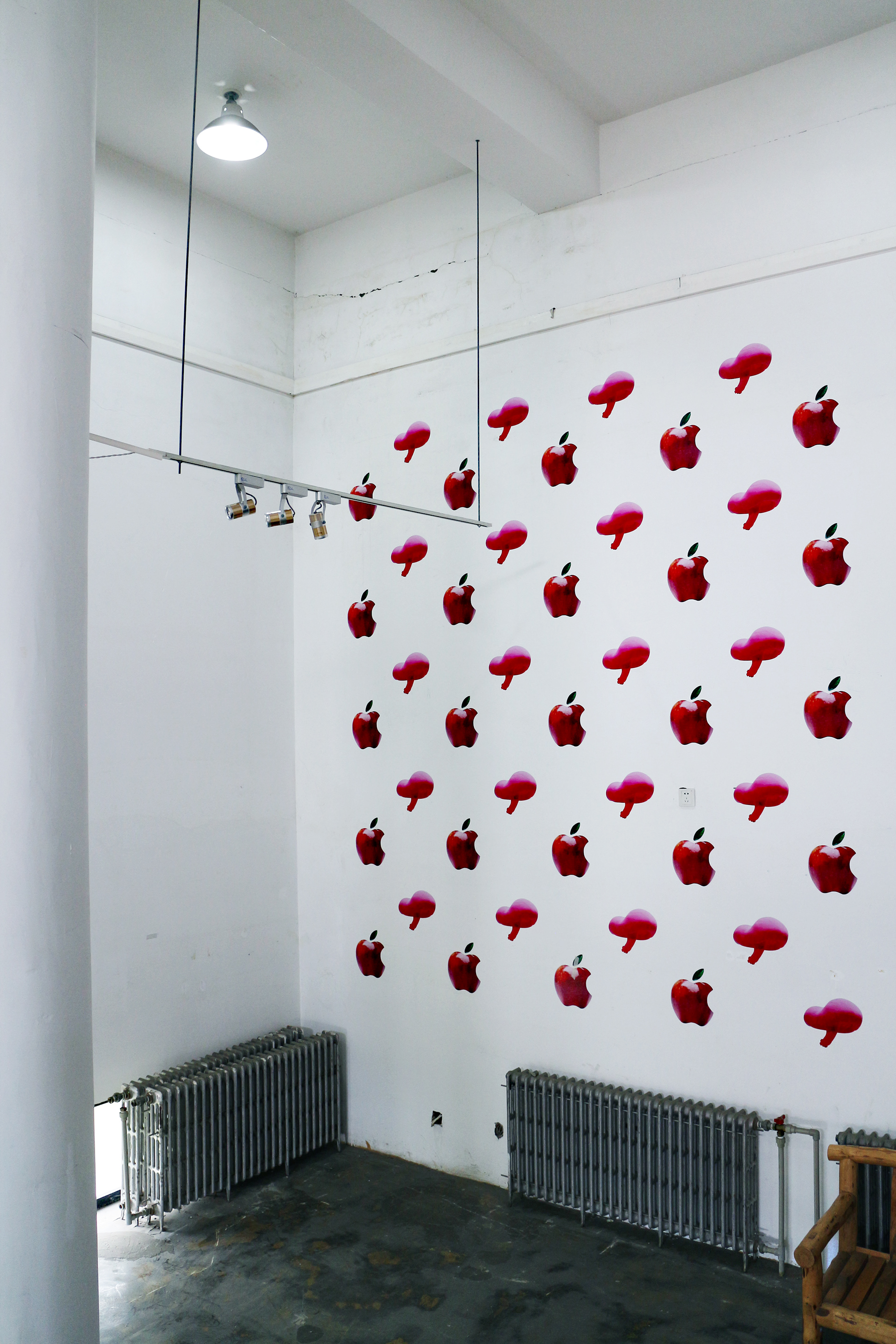 The pattern of apples and pink mushrooms covering the entire wall means an addiction in the repetitive life. It is not easy to confess that you desperately need someone. Taking out apples and pink mushrooms filled in me one by one and attaching it to the wall is showing my obsession and confessing someone that I need that person. I myself also want to find a new direction while respecting the passion of people who continue their own search in the repetitive and obsessive daily lives. How can we soothe the hunger created by not getting full recognition, and how can we recognize those who are not like-minded? We should not be captured by the futility that longs for more understanding and more kindness of human beings.