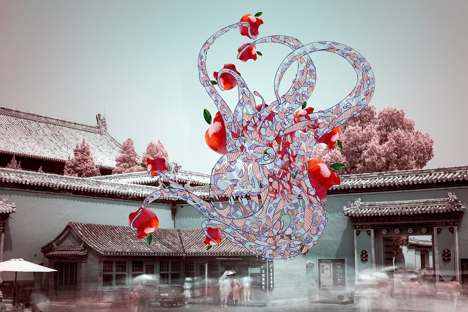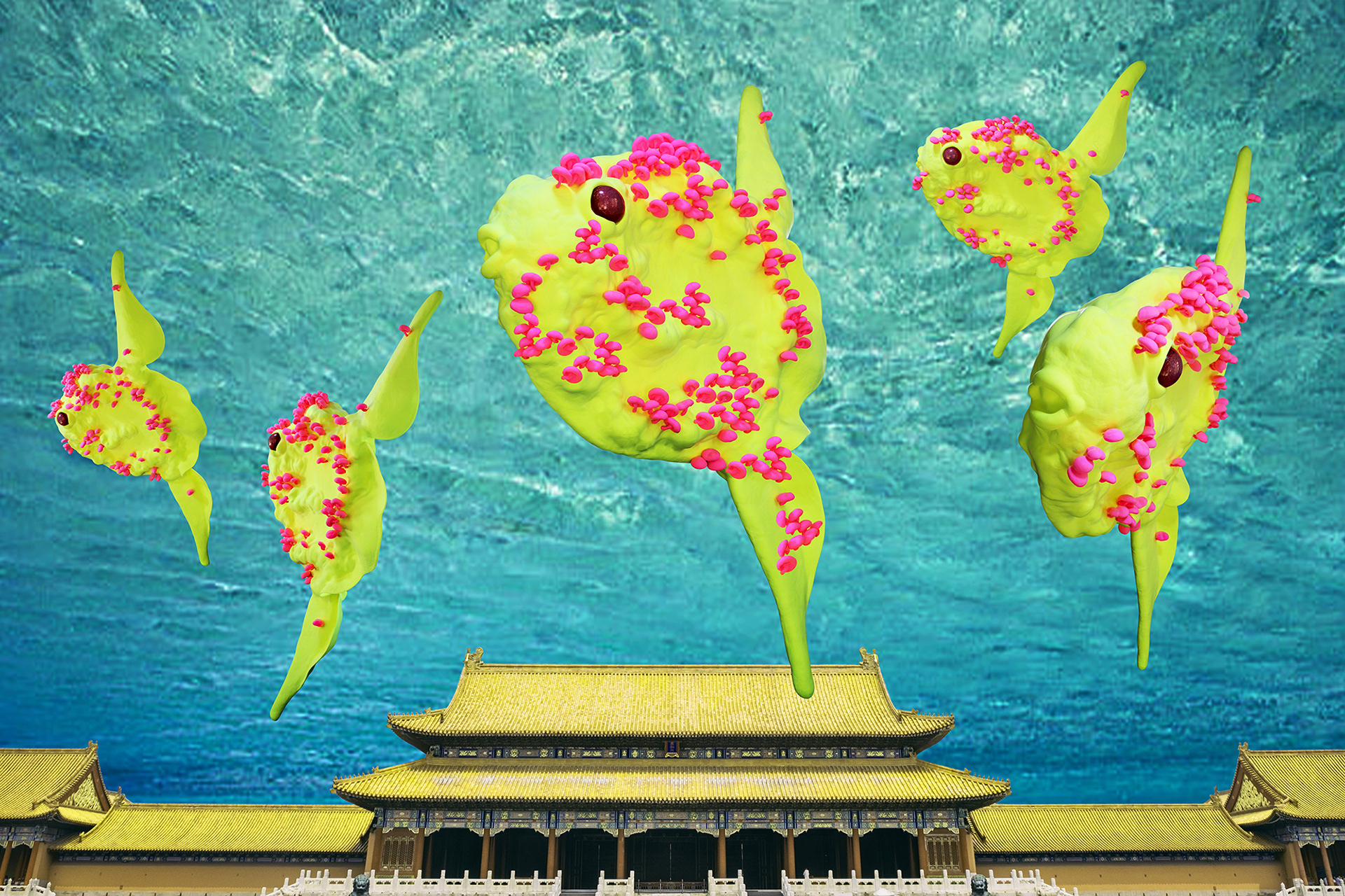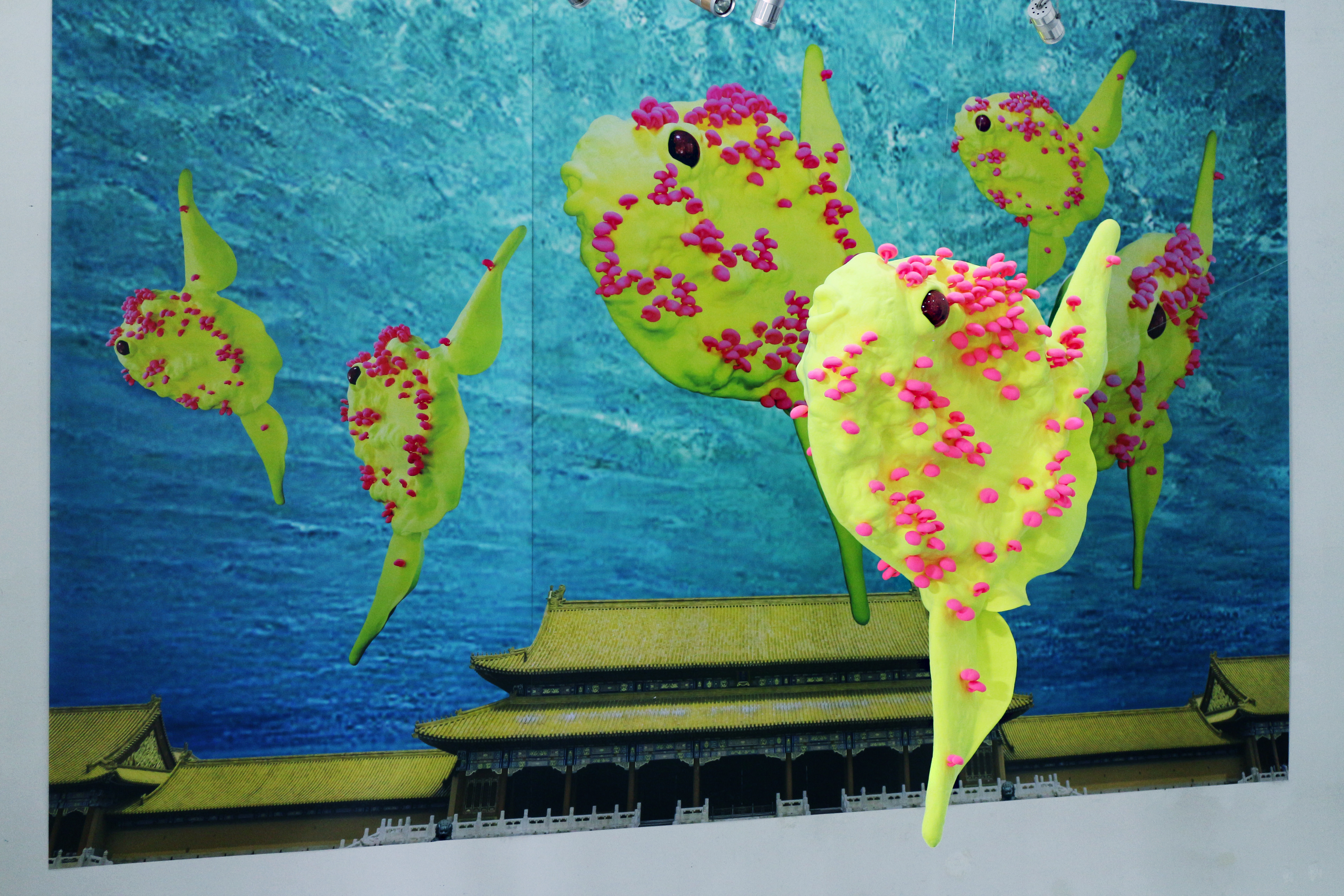 The vast Forbidden City is filled with seawater. The Sunfish bloomed from a pink mushroom is unhurriedly swimming around the City as if it is the lord of the City. The Forbidden City where a lot of kings in China had resided is submerged into seawater with a brilliant golden rooftop. This place is filled with people like the sea is filled with water, and the people want to shine by themselves, rather than the Forbidden City, which may lose its shinning light without endless repairs.