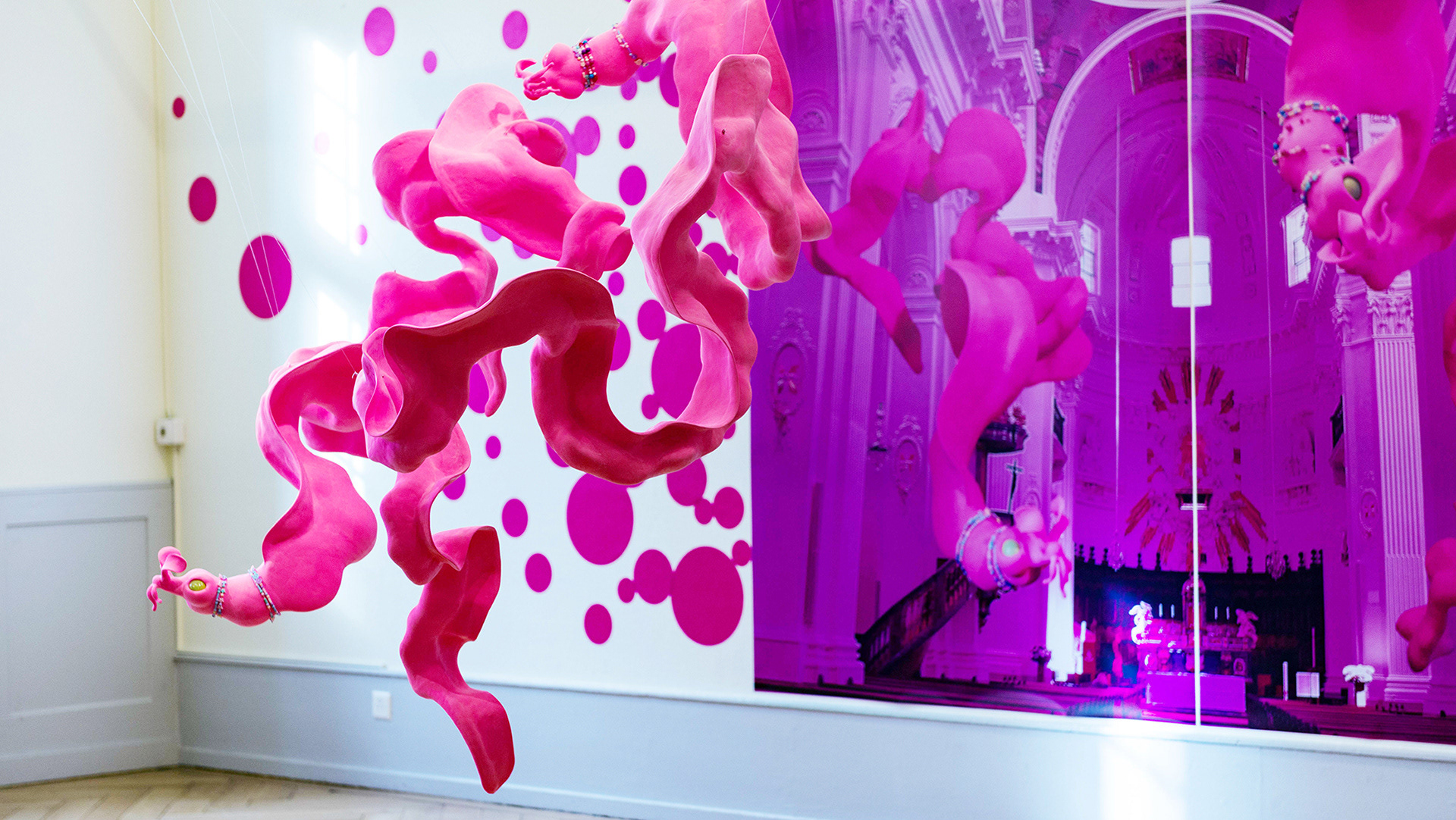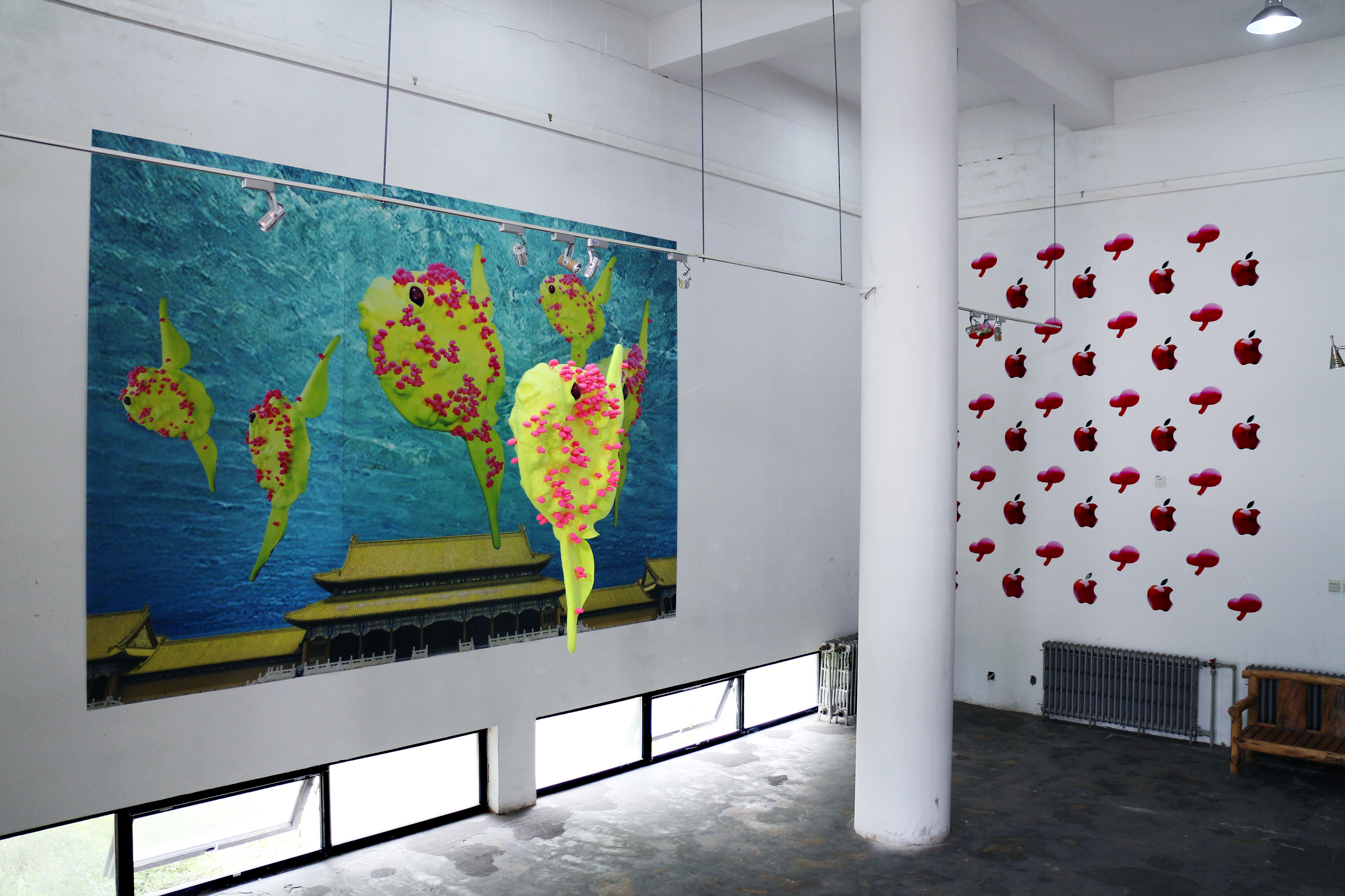 Pattern of Apples and Pink Mushrooms_ Polymer clay, epoxy, sponge_340*500 (Installation of variable)_2017
