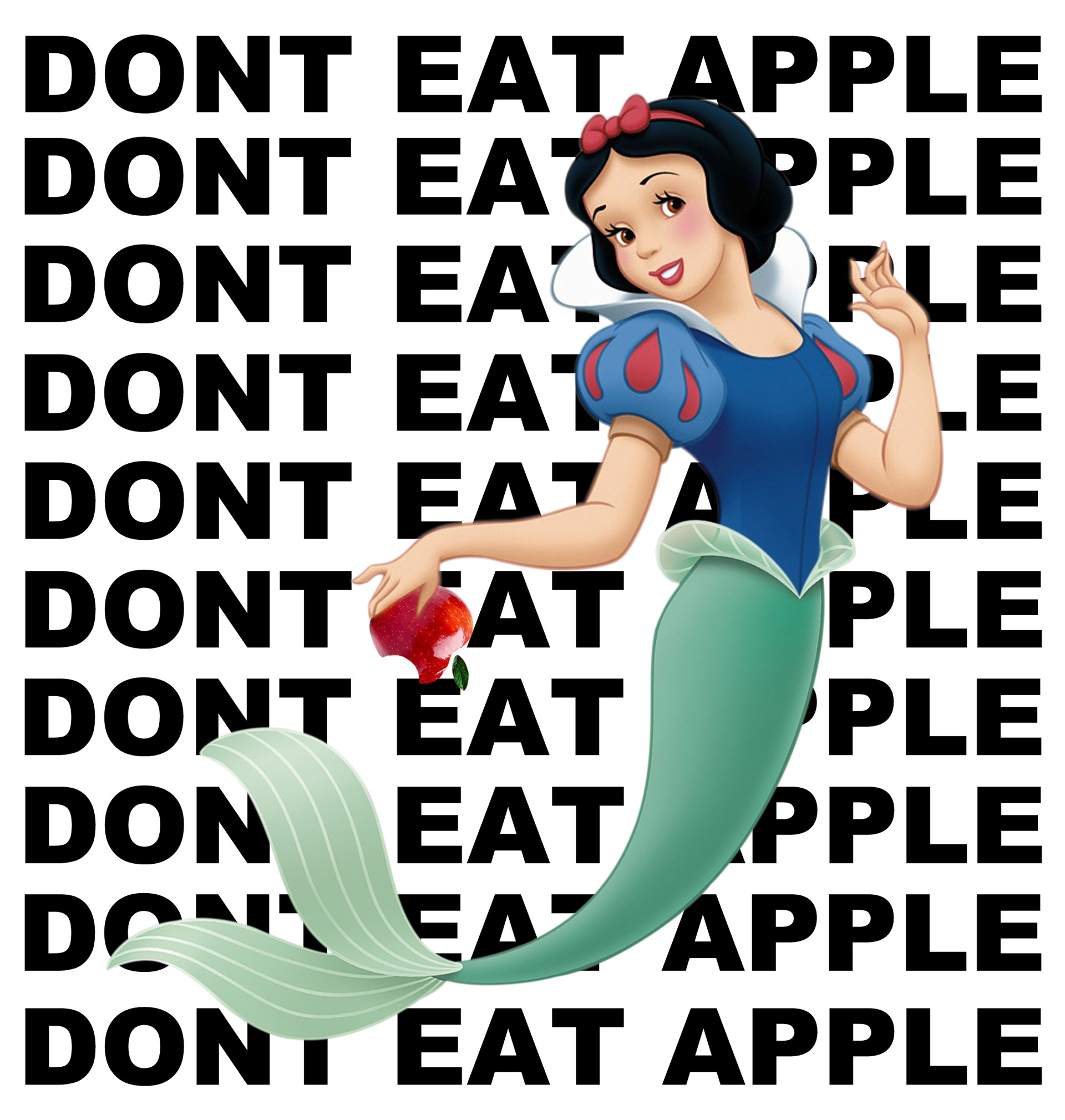 독이든 사과를 먹고 죽을뻔한 백설공주는 다시는 사과를 먹지 않게 되었습니다. 두 다리로 땅을 딛고 걷는 것 이상의 것을 하고 싶었던 공주는 인어의 지느러미를 갖고 바다를 자유롭게 헤엄치길 원했습니다. 그러나 지느러미를 갖기위해서는 두 다리를 포기해야 했습니다. 인어의 지느러미를 가진 백설공주는 모든 이들에게 독이 든 사과 대해 경고하고 있습니다.
