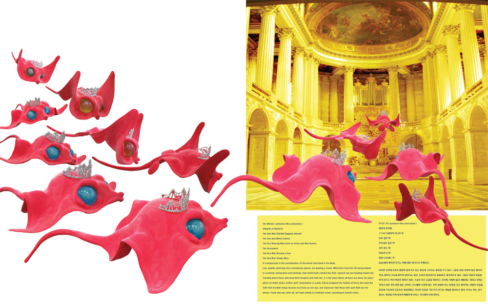 The mentality of those who wear high heels as if they are obsessed with something that they cannot give up is to look for superior status and place themselves in a higher and more confident standing. However, deep inside of such mentality lies a fear: a fear that they might not be recognized and that they might be forgotten, and a fear of nothingness in self-existence, which leads them to try to fill a feeling of emptiness by means of something. Such a feeling emptiness in mind, unfortunately, cannot be filled by themselves but only by positive energy of outside. Finally, they apprehend that the emptiness can only be filled when they abandon all obsession they hold. Origin of human satisfaction may lie in the features of life in which something to hold and guard remains. The value of life differs greatly, depending on what you may give up or abandon, and what you may hold and safeguard. Living the life in a way that keeps one's thoughts, without losing faith, cause a fierce struggle. The image of the one who conquers such a struggle may be something like swimming toward a glorious standing in a crown.