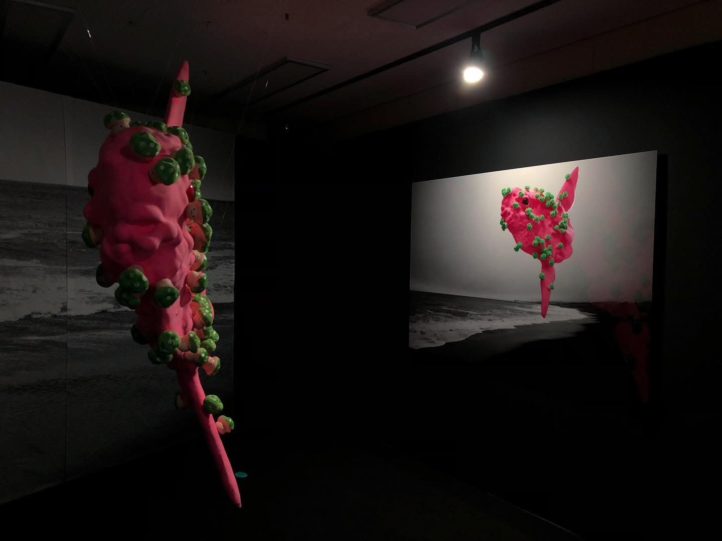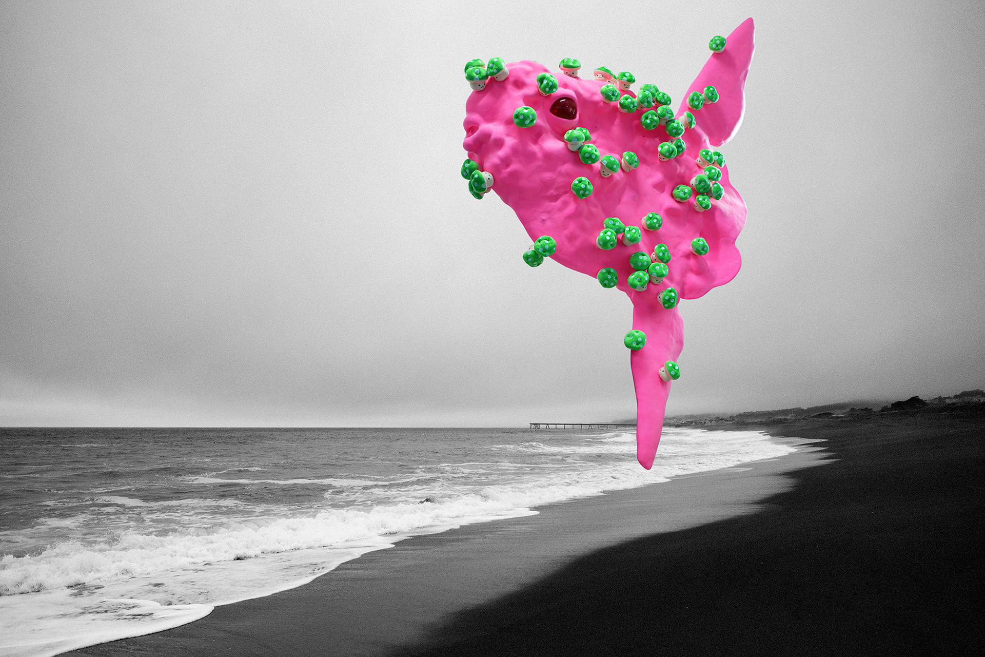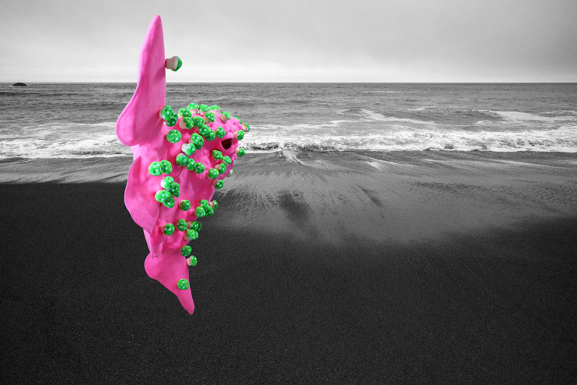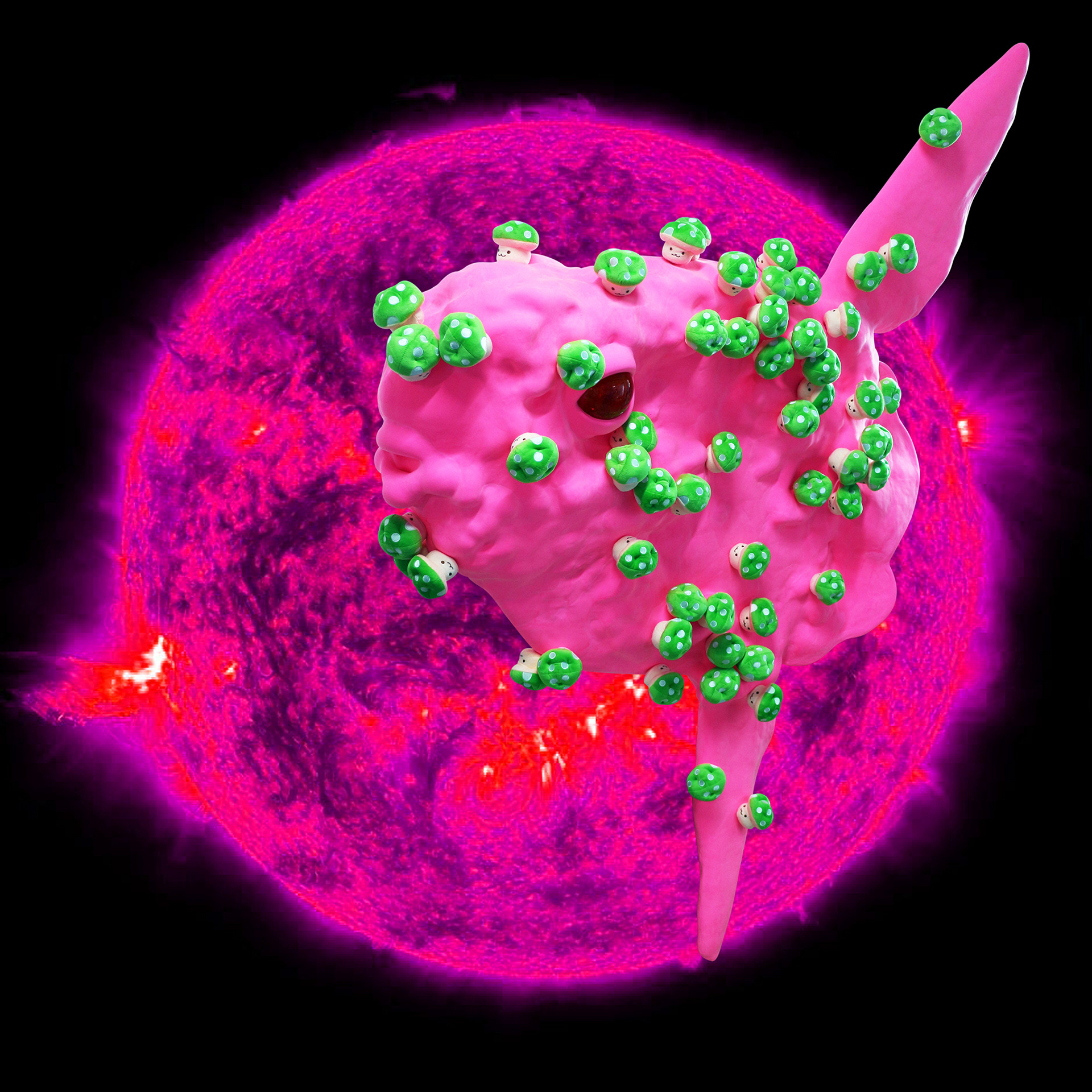 Sun fish, with its burning pink florescent color, emerged to this black sea. The mushrooms, covering every part of its body, contains lethal poison but still they appear to be beautiful and useful. These poisonous mushrooms managed to multiply quickly as if they felt the urge of necessity to do so, almost like they were falling in love controllably with something unknown. However, these mushrooms also look as if they were merely a mirage, so easily dissoluble and never to be found again. The bright pink Sun fish from the story of the fairy tale, could actually exist in this world somewhere, somehow. Sun fish willingly and voluntarily left the dazzlingly beautiful burning Sun to travel a long way to meet the Black Sea.
