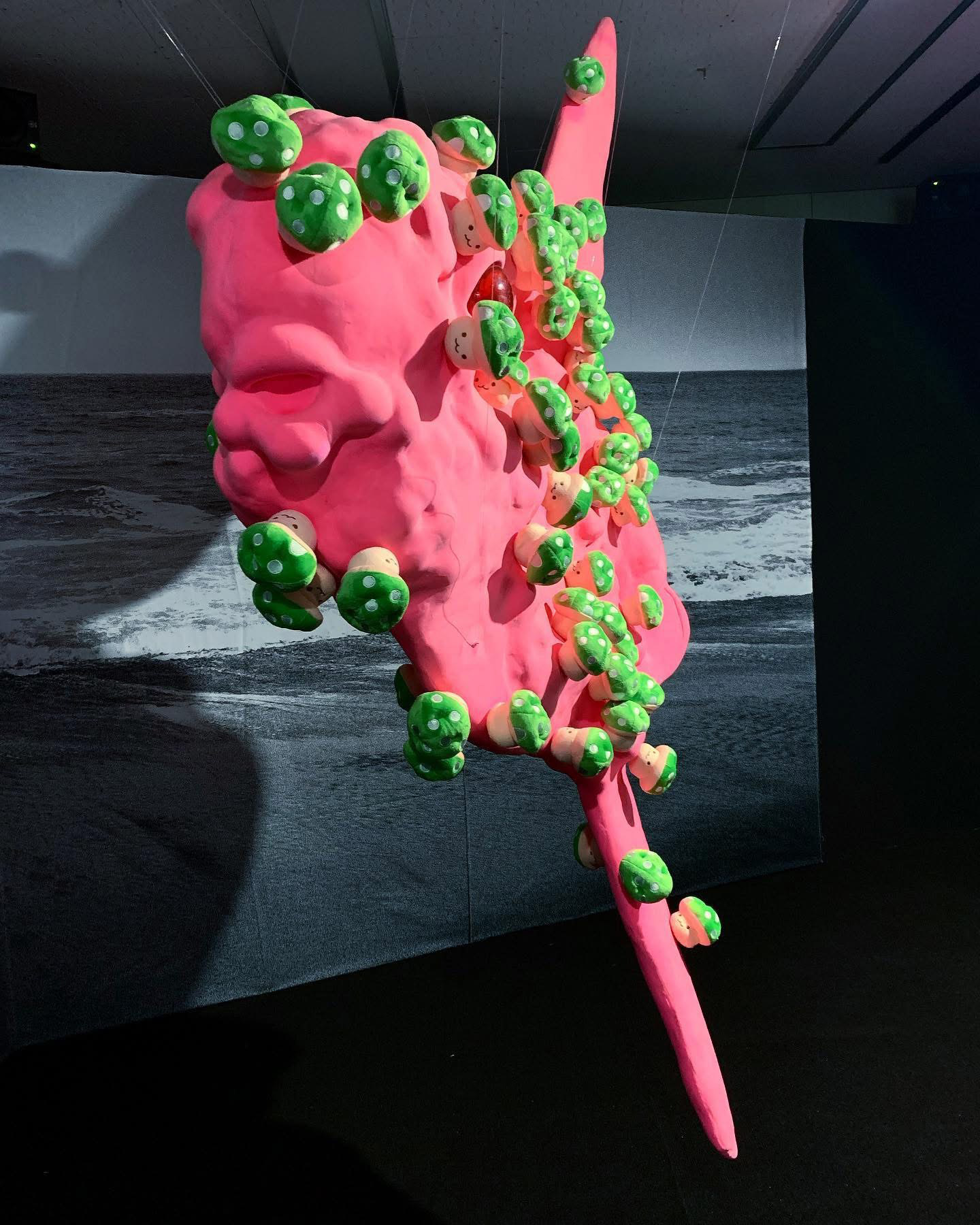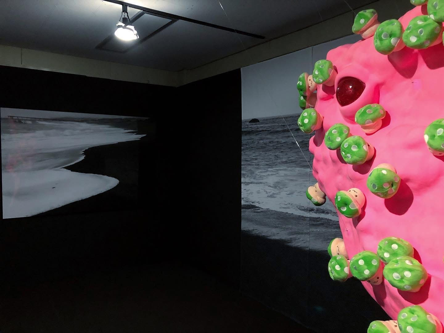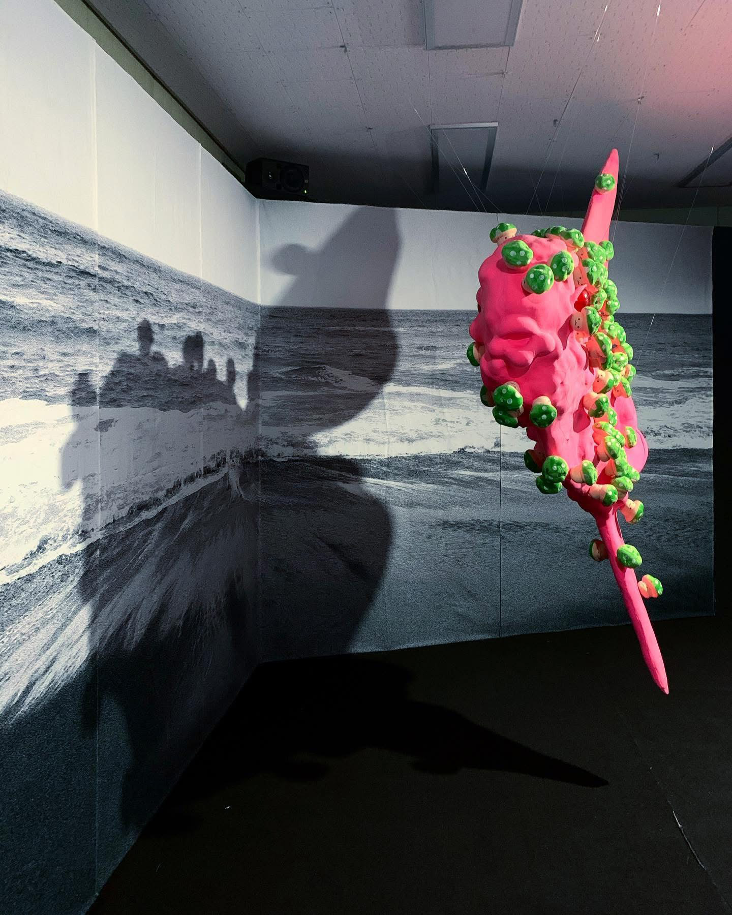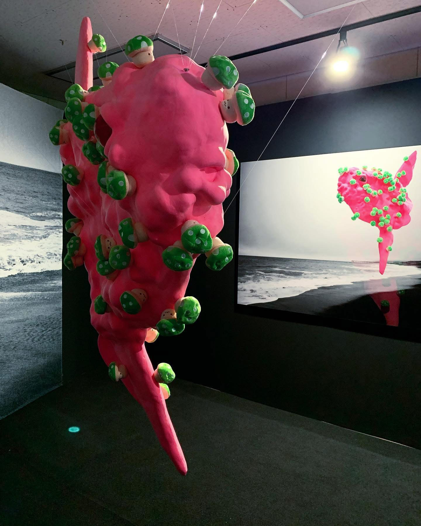 Sun fish, with its burning pink florescent color, emerged to this black sea. The mushrooms, covering every part of its body, contains lethal poison but still they appear to be beautiful and useful. These poisonous mushrooms managed to multiply quickly as if they felt the urge of necessity to do so, almost like they were falling in love controllably with something unknown. However, these mushrooms also look as if they were merely a mirage, so easily dissoluble and never to be found again. The bright pink Sun fish from the story of the fairy tale, could actually exist in this world somewhere, somehow. Sun fish willingly and voluntarily left the dazzlingly beautiful burning Sun to travel a long way to meet the Black Sea.