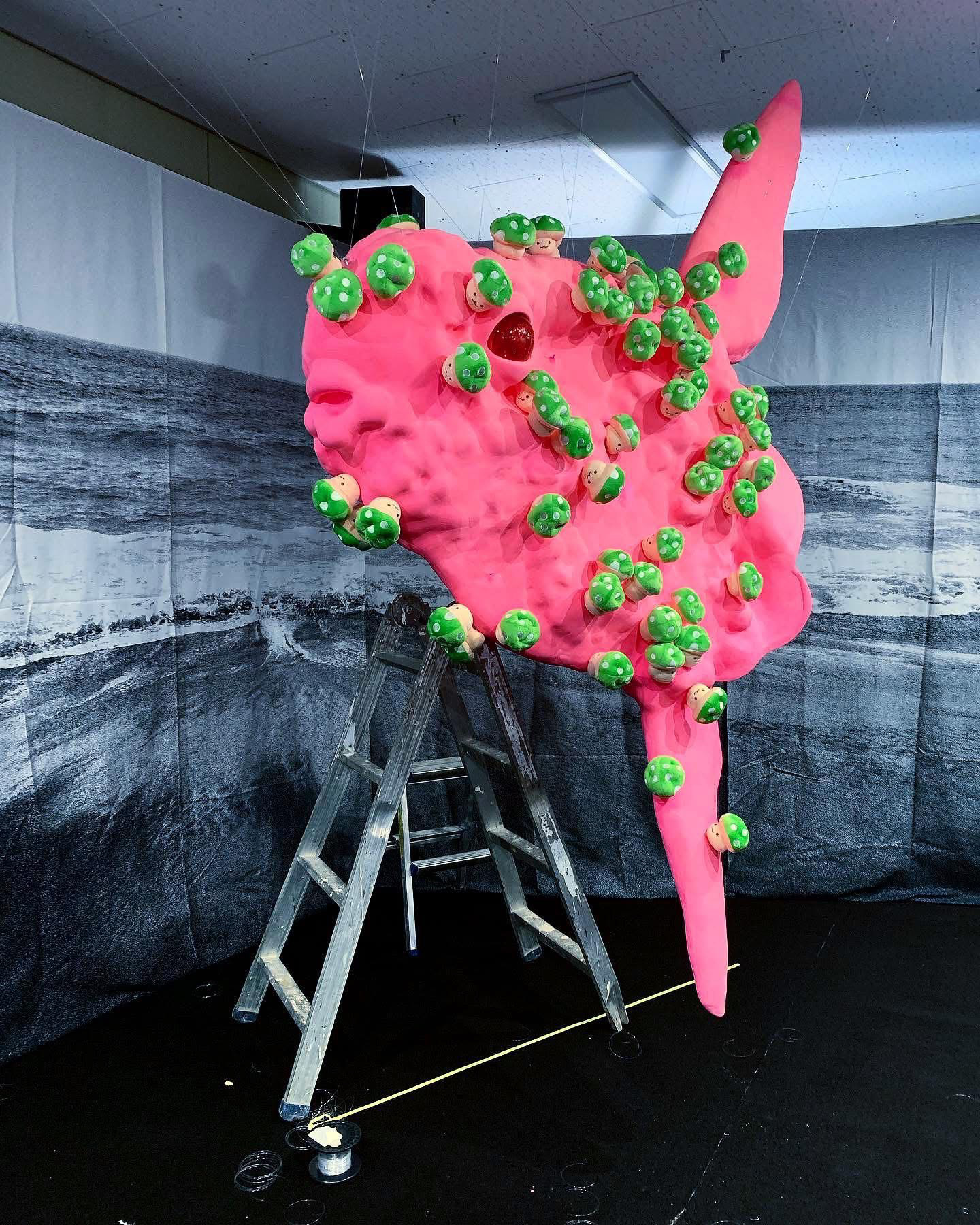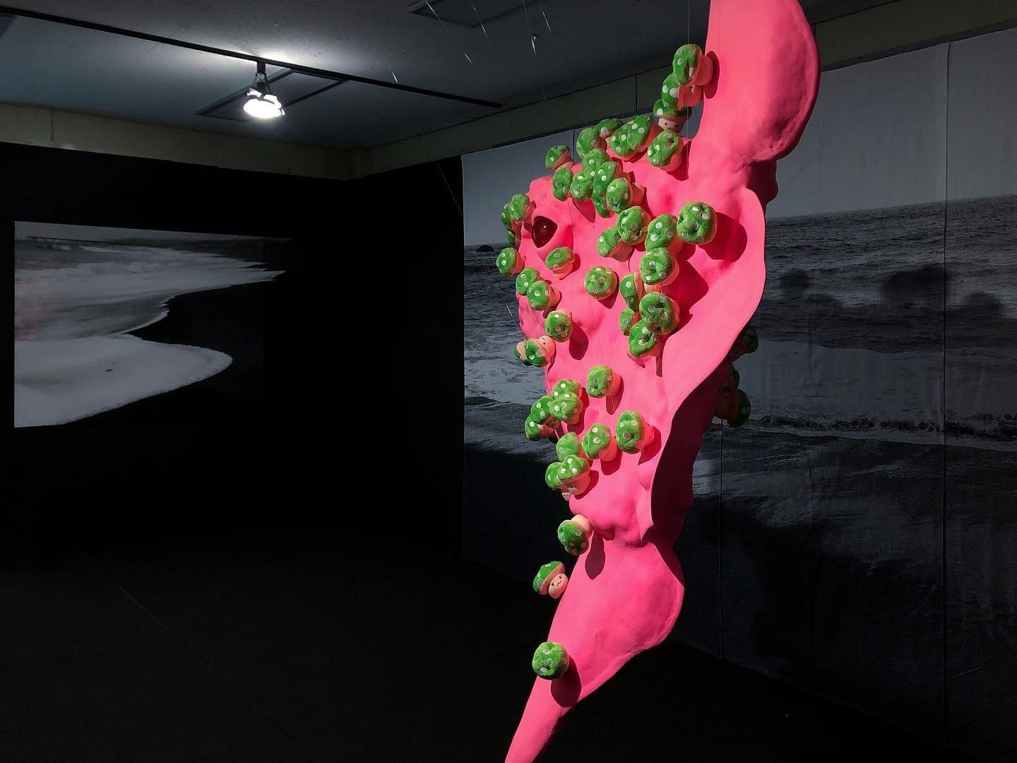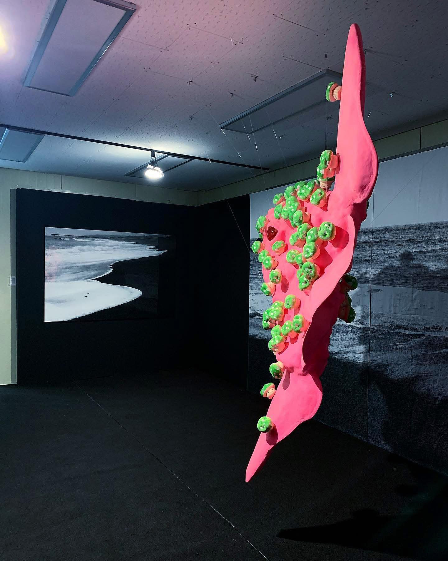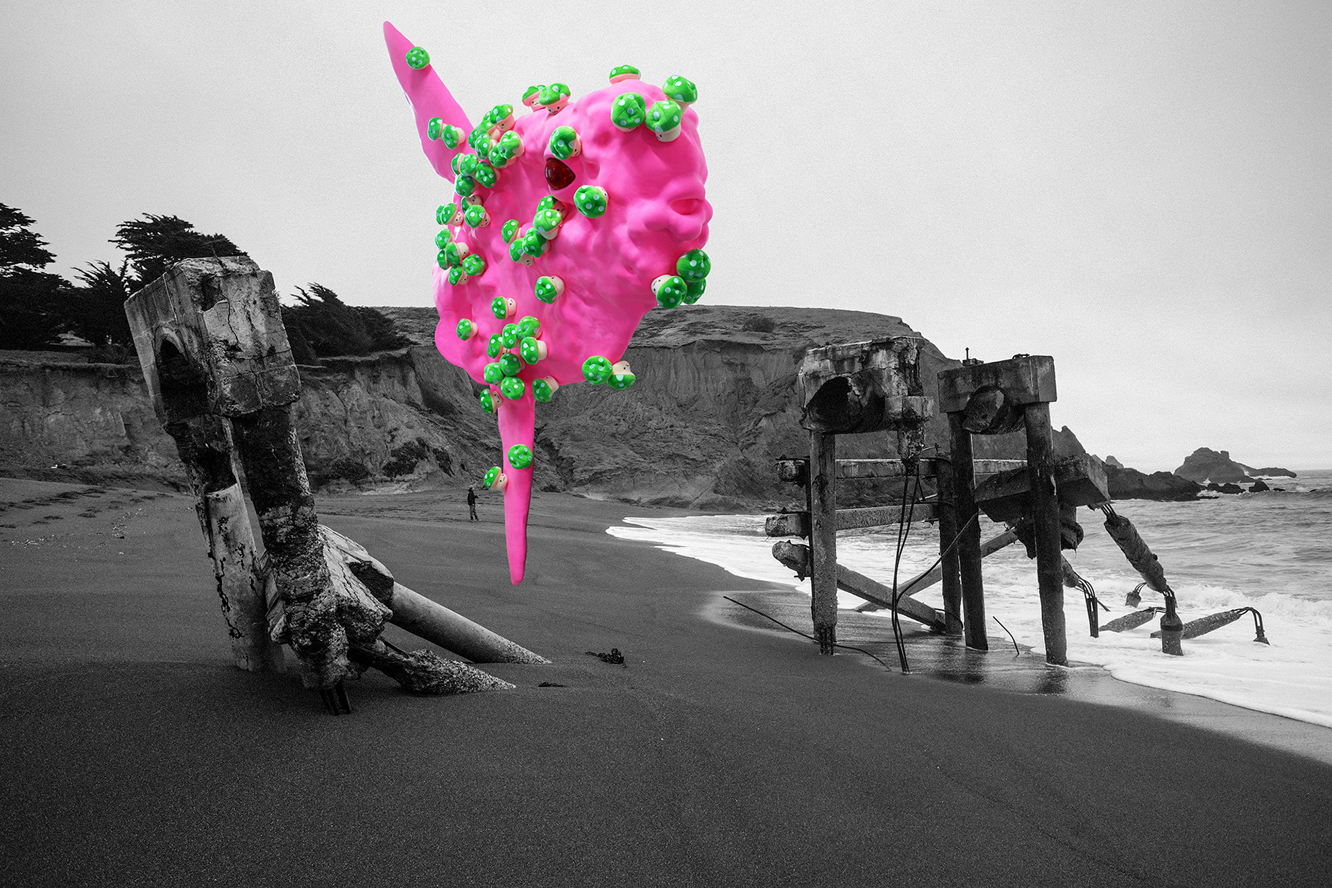 Sun fish, with its burning pink florescent color, emerged to this black sea. The mushrooms, covering every part of its body, contains lethal poison but still they appear to be beautiful and useful. These poisonous mushrooms managed to multiply quickly as if they felt the urge of necessity to do so, almost like they were falling in love controllably with something unknown. However, these mushrooms also look as if they were merely a mirage, so easily dissoluble and never to be found again. The bright pink Sun fish from the story of the fairy tale, could actually exist in this world somewhere, somehow. Sun fish willingly and voluntarily left the dazzlingly beautiful burning Sun to travel a long way to meet the Black Sea.