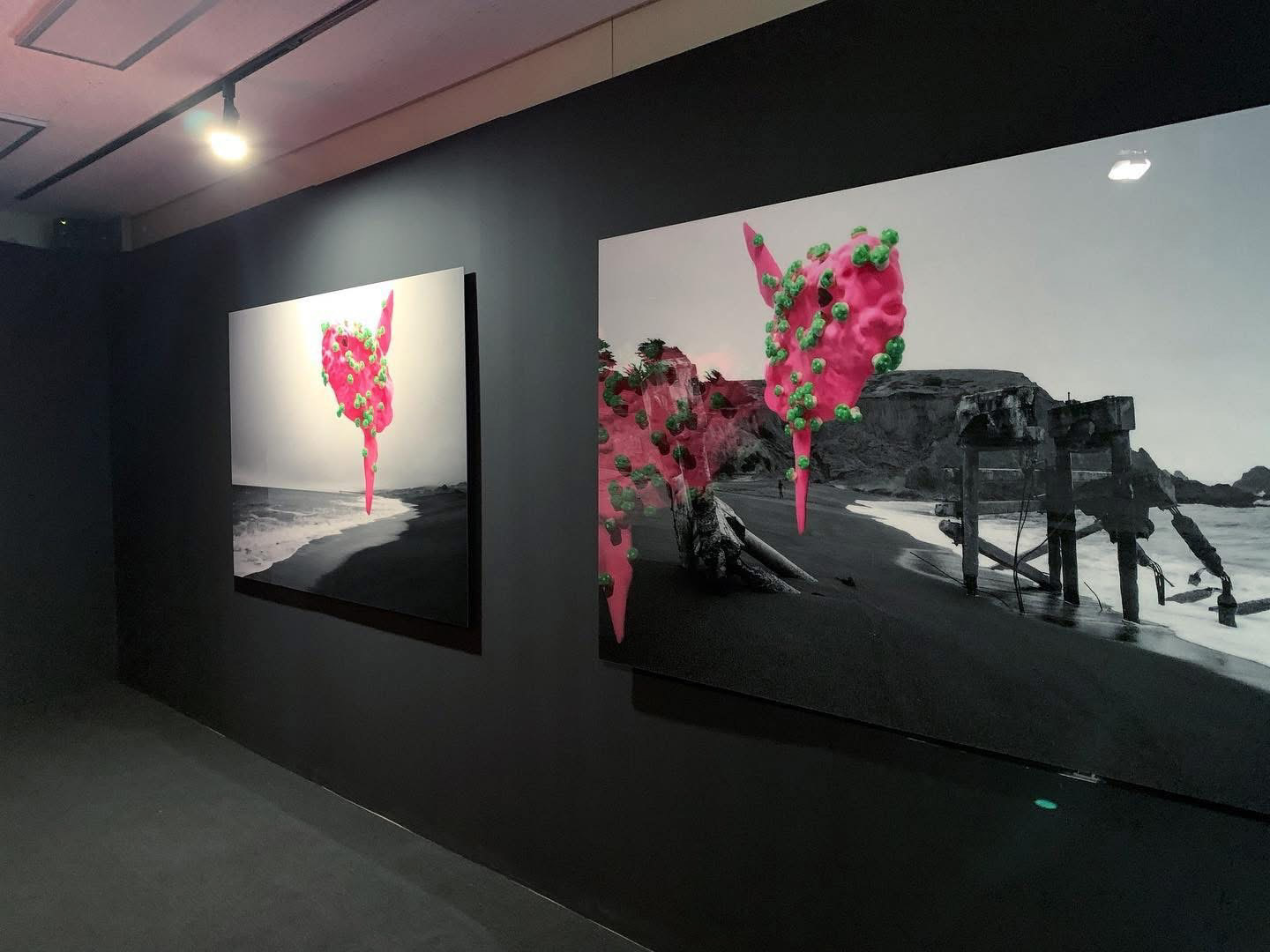 The photographer aimed to capture the dynamic seas of Sri Lanka and San Francisco in black and white photography as rain and typhoons were hitting the areas. The artist stood at the edge of the ocean all alone, emptied and deserted due to the rainstorm. The photography of the black sea, calmly and quietly capturing the lonely and damp sea, delivers a sense of solitude as if one is standing at the end of the world, all by oneself. Nevertheless, the sea with its ever so beautiful current and waves fascinated and attracted the photographer that the photographer ended up capturing quite a few of these serene and tranquil landscape, On the other hand, the other artist who was looking at the same photography, discovered a pink colored Sun fish from this black sea image and developed a unique moment of the encounter between two very different natures.
